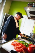 Manch einer bringt alles durcheinander oder ist nicht befähigt zu differenzieren. Nicht so unser Mann hinterm Herd, wie es scheint, ein waschechter Stuttgarter, den ich kennenlernte, wie ihn alle Jazzfans beschreiben würden: mit langem Pferdeschwanz. Wolfgang widmet sich der Entdeckelung der grünen Paprika. Reife Früchtchen rundum, denn die Paprika ist schlicht eine Beere – aus botanischer Sicht, vernehme ich. Große Scheiben werden mit Sorgfalt geschnitten, nachdem die Kerne im Innern entfernt worden waren. Sodann wendet sich der Urschreivater des Jazzpianos in Deutschland den großen und fetten Ochsenherztomaten zu. Auch hier findet eine Scheibelung statt.