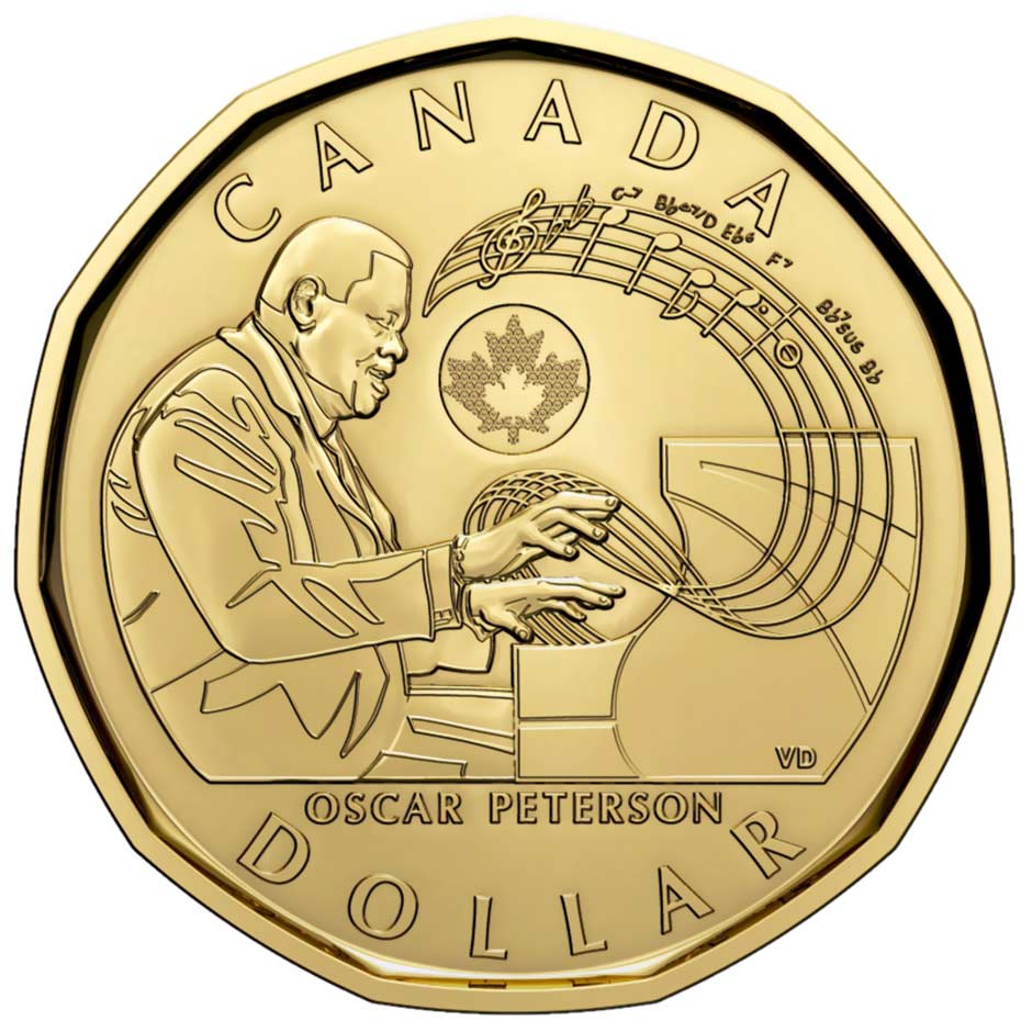 Oscar-Peterson-GedenkmünzeEr ist der wohl bedeutendste Jazzmusiker, den Kanada je hervorgebracht hat. Jetzt wird der vor 15 Jahren verstorbene Pianist Oscar Peterson mit einer Gedenkmünze geehrt. Zu seinem 97. Geburtstag am vergangenen Montag wurde die kanadaische 1-Dollar-Münze in Umlauf gebracht. „Ich freue mich sehr, dass Oscar Peterson, der erste kanadische Musiker, der auf einer Umlaufmünze erscheint, als einer der weltweit angesehensten und einflussreichsten Jazzkünstler aller Zeiten gewürdigt wird“, sagte Marie Lemay, die Präsidentin der „Royal Canadian Mint“. „Mr. Petersons Musik und seine legendären Auftritte haben Millionen von Musikliebhabern in Kanada und auf der ganzen Welt Freude bereitet, und wir sind stolz darauf, ihn mit dieser Münze für seine außergewöhnlichen Beiträge zur kanadischen Musik und Kultur zu ehren.“ Die Oscar-Peterson-Gedenkmünze wurde vom Künstler Valentine De Landro entworfen, einem versierten Comiczeichner, Illustrator und Designer aus Ontario. Sie zeigt Oscar Peterson am Klavier, seine Hände in voller Bewegung, aus denen sich eine fließende Tonleiter mit den beiden Schlusstakten aus seiner Komposition „Hymn To Freedom“ ergibt.